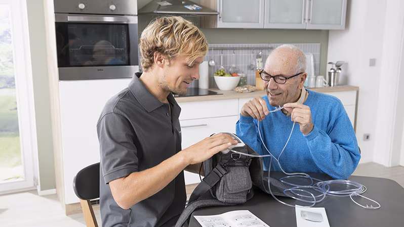 Senior erhält Beratung zur Sauerstofftherapie zu Hause. Starten Sie mit uns Ihre Sauerstofftherapie. So geht's.