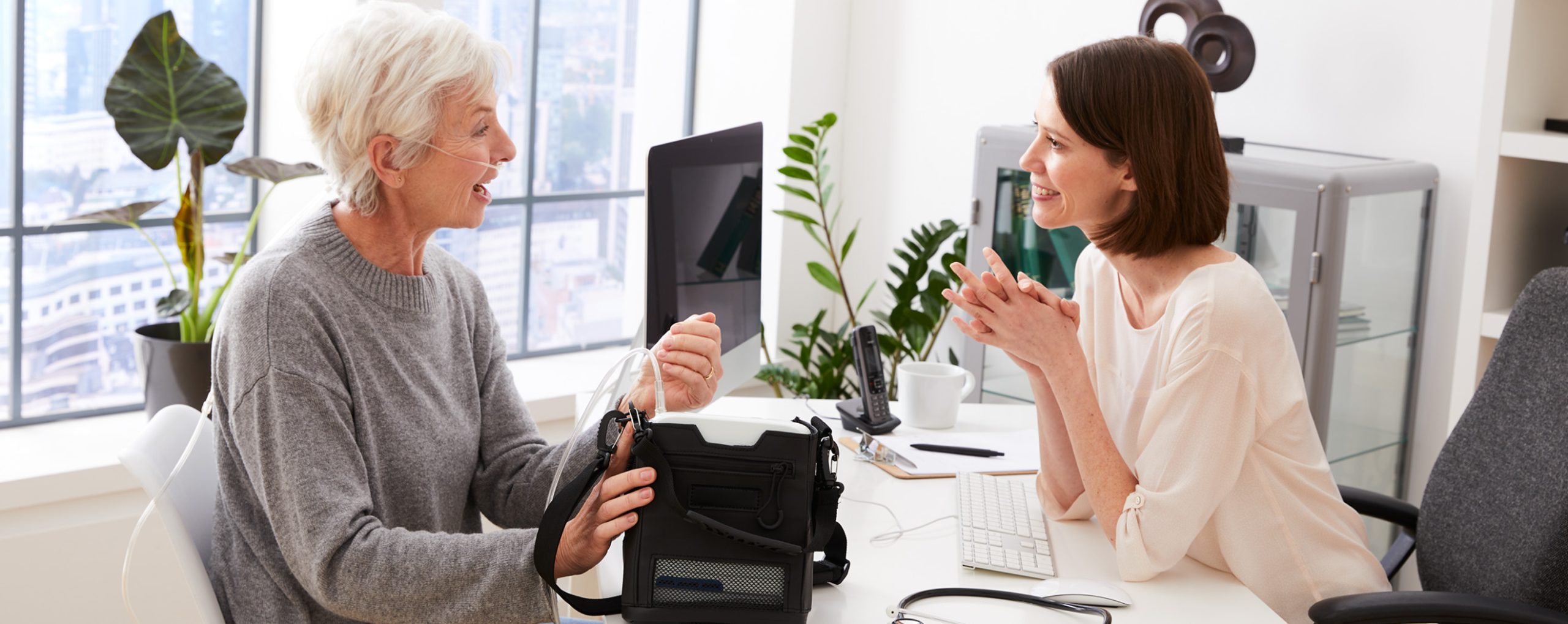 Senior erhält Beratung zur Sauerstofftherapie zu Hause. Starten Sie mit uns Ihre Sauerstofftherapie. So geht's.